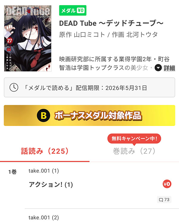 「DEAD Tube」はマンガBANGで無料で最新話近くまで読めましたが、2023年9月30日で無料期間が終了しました。