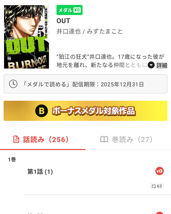 OUT(漫画)を無料で234話分読めるアプリ!